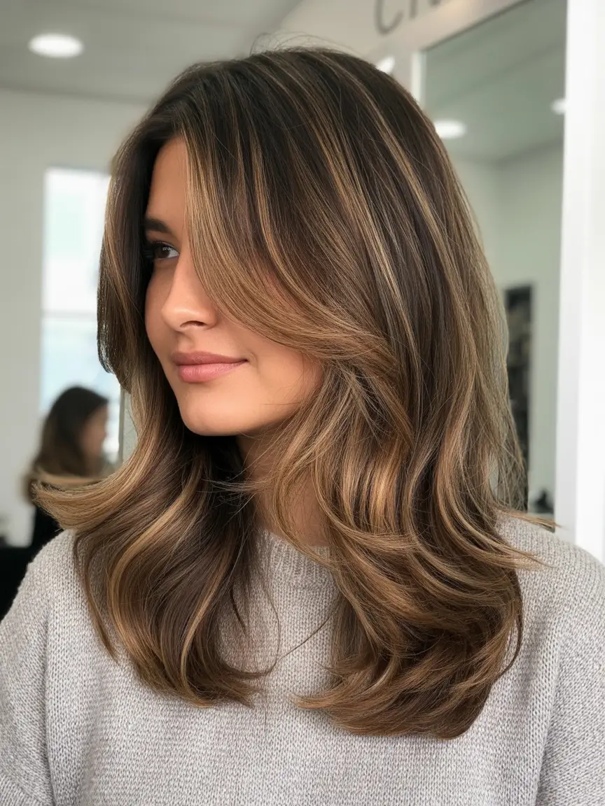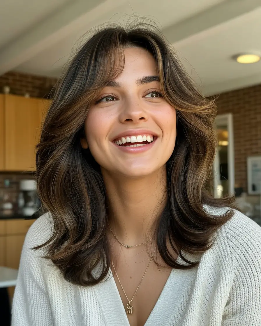 Soft, face-framing layers are something that makes it feel like one is breathing out. This appearance is all motion–lively, but natural, with all the strands falling into their natural places. The faint caramel shades fade into the dark mocha foundation, which adds that glowing aspect that everyone desires during colder weather in the winter. It is a classic medium length winter haircut, which is ideal to those who want it to be light but not too thin.