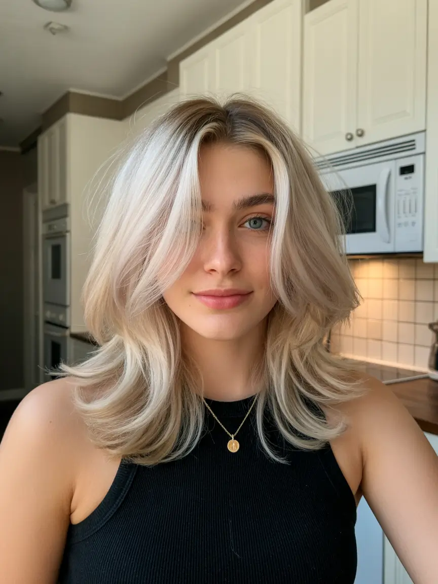 This appearance is icy elegant, the feathered layers on the bright blonde are crisp and modern and are a perfect match during winter. It directs that medium length haircut winter aespa aesthetic of light-reflective color, clear structure and smoothness around the face. The layers are slightly floating, almost graceful and light despite the heavier winter fabrics.