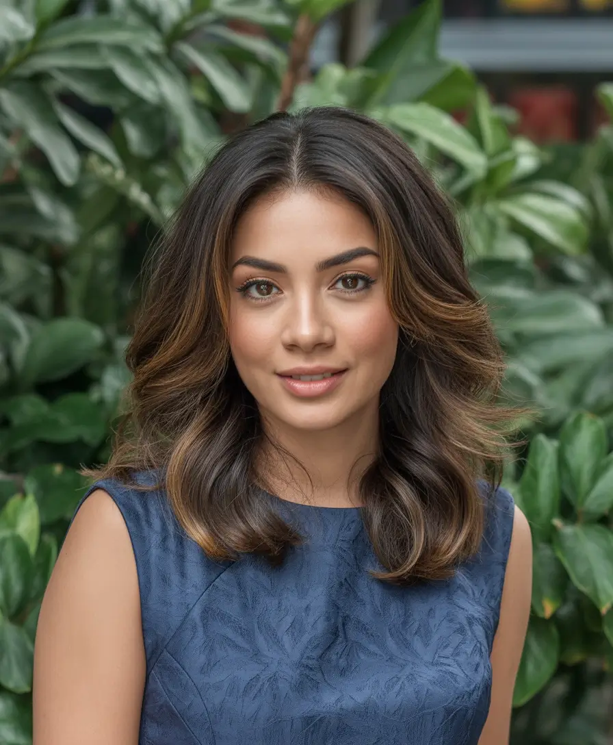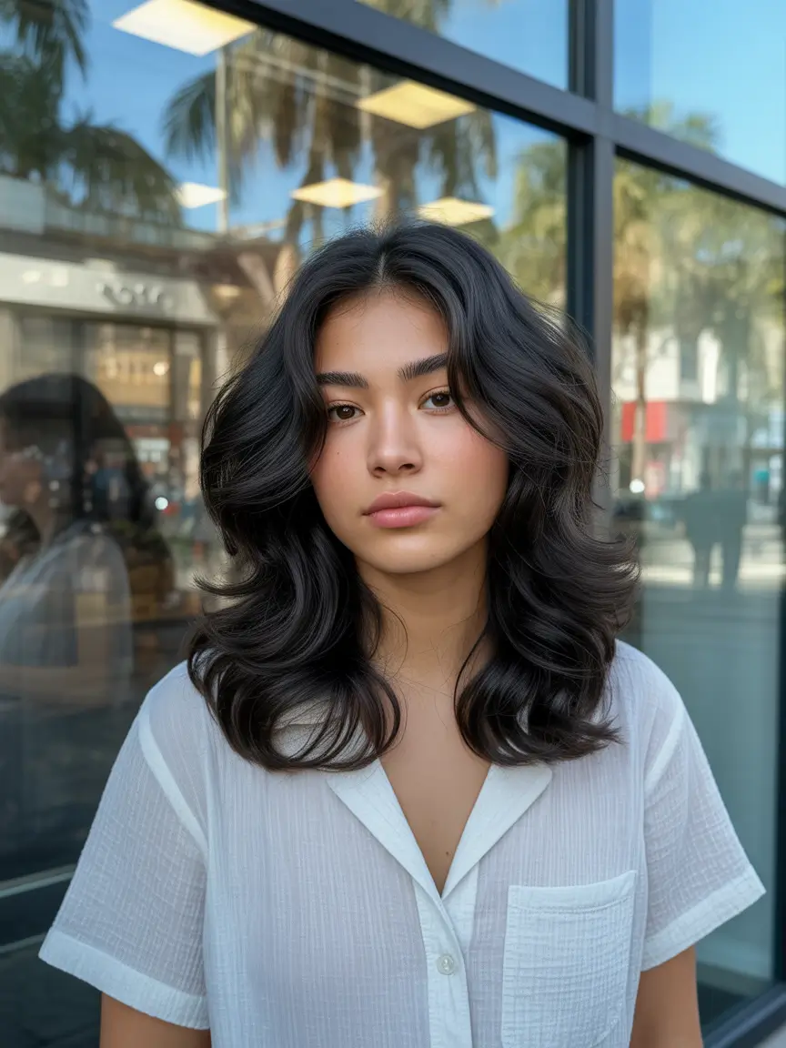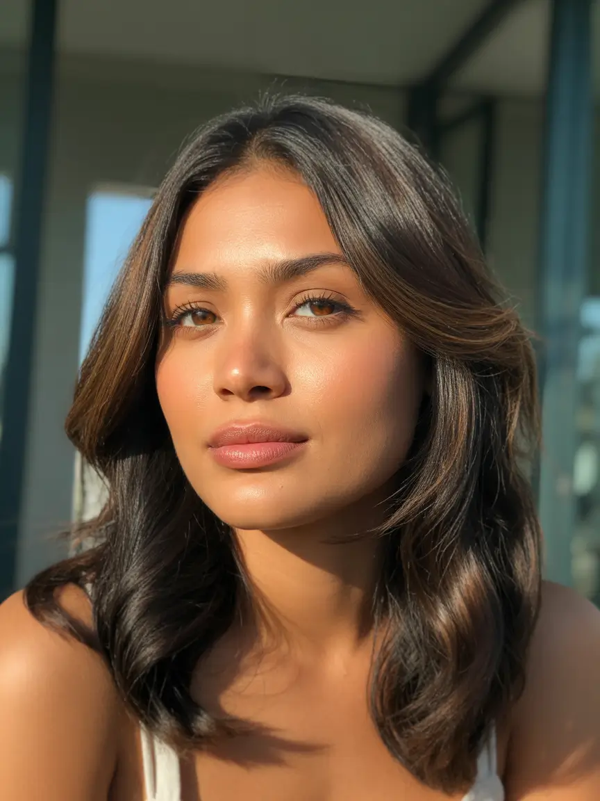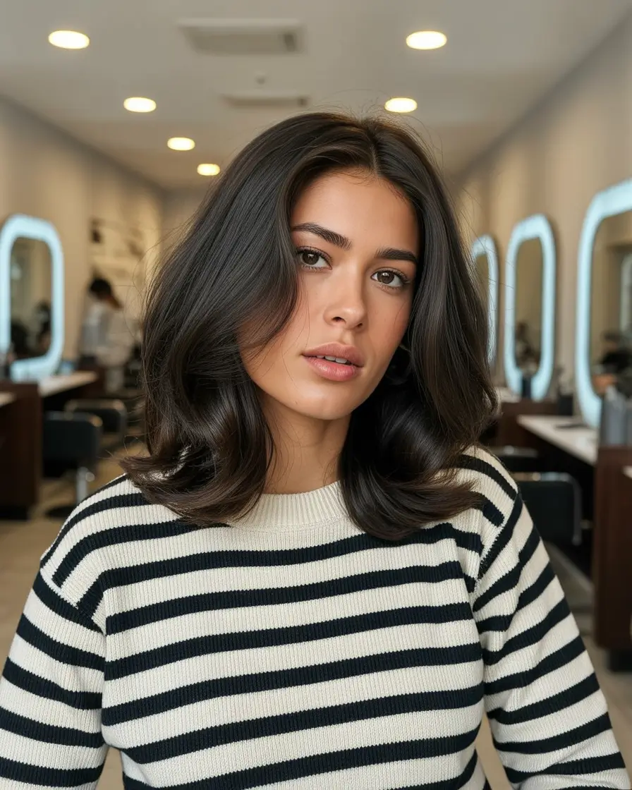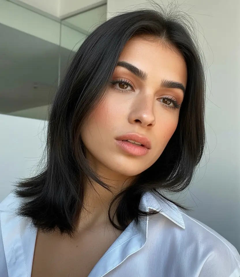 There’s an elegance in simplicity, and this haircut nails it. A winter medium haircuts favorite, it features sleek, mid-length layers with soft flicks at the ends — understated but perfectly shaped. The clean structure gives it a professional edge while staying ultra-feminine.