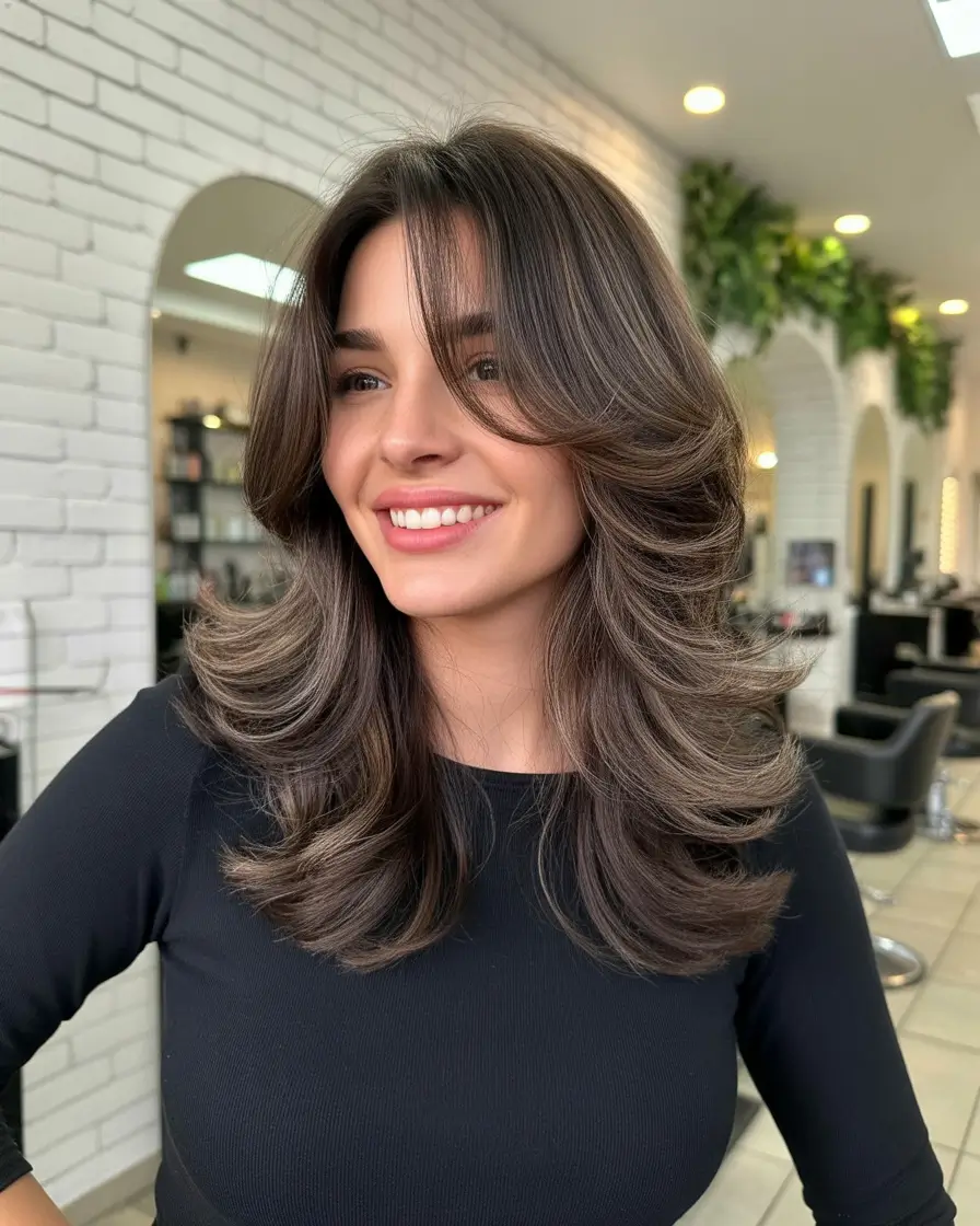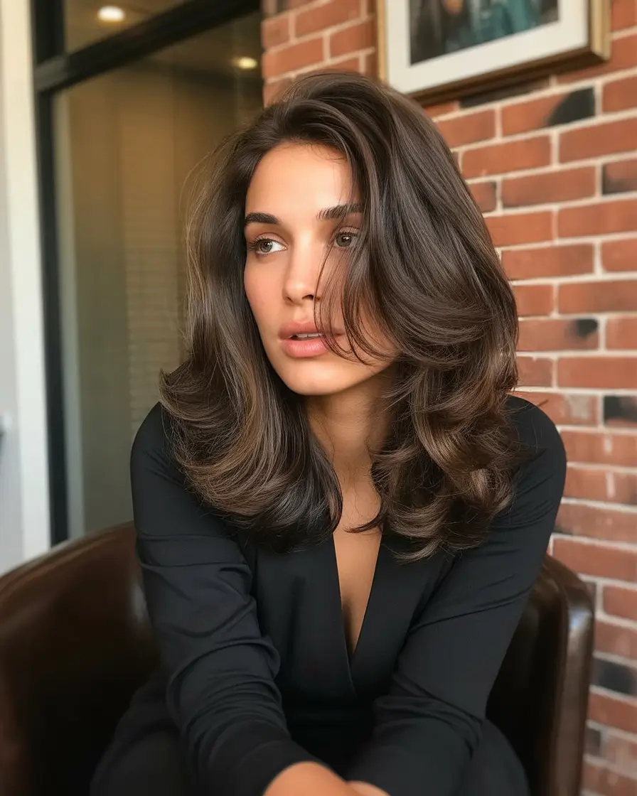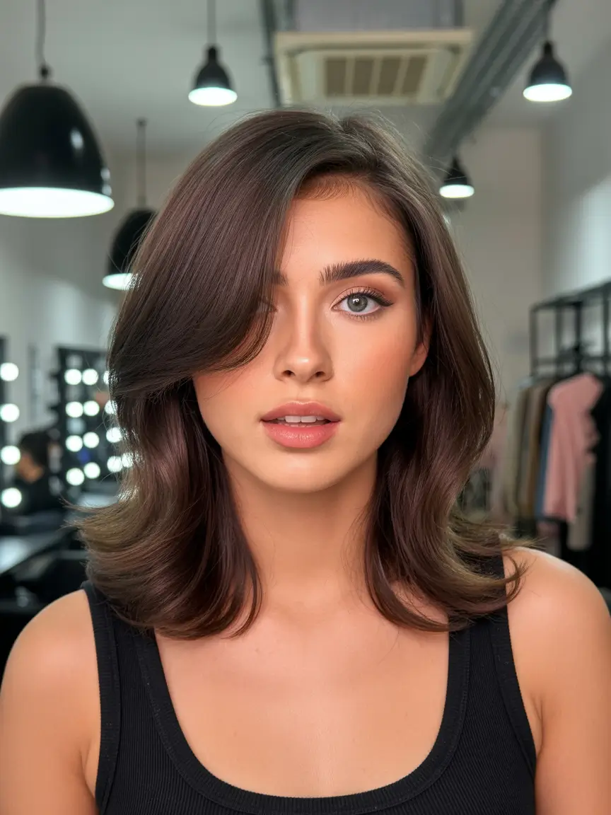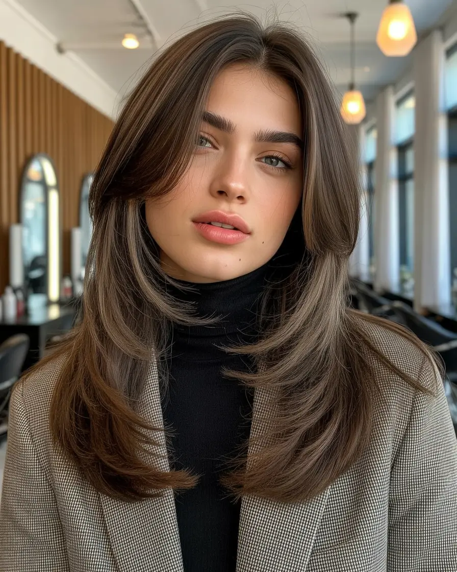 Chestnut hair that moves like velvet is something timeless, makes one feel so grounded and luxurious. That energy is precisely what this haircut encapsulates: long, feathered layers, a side bang that flows in the shape of a gentle curtain, and the slight inward bend at the ends which leaves it polished effortlessly. It is one of my favorite medium haircuts that suits in winter as it is not too warm, or too structural – a little 70s, a little now.