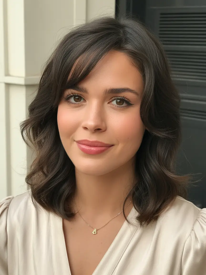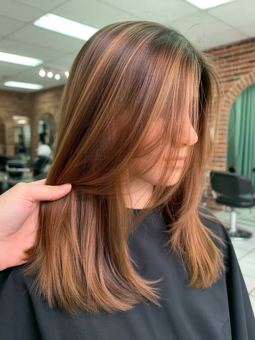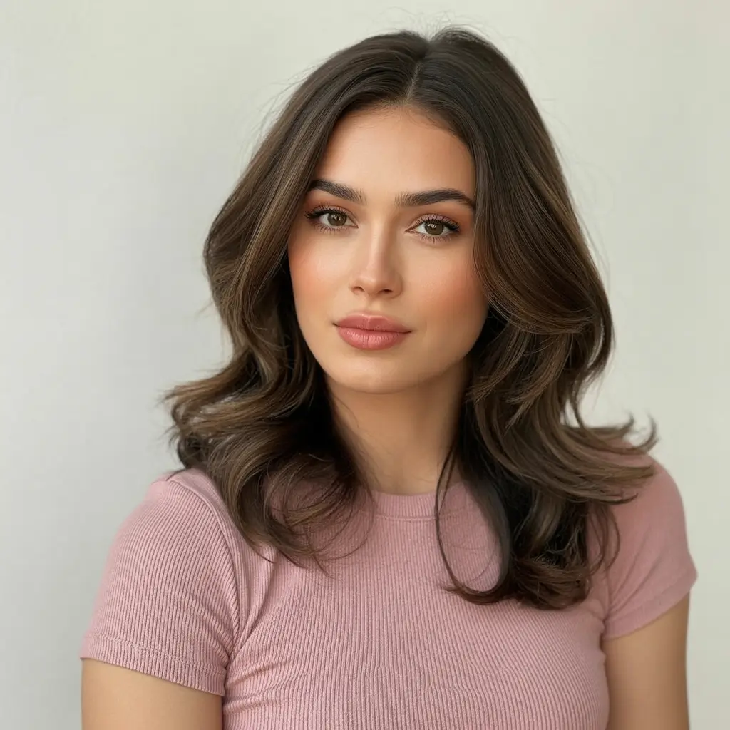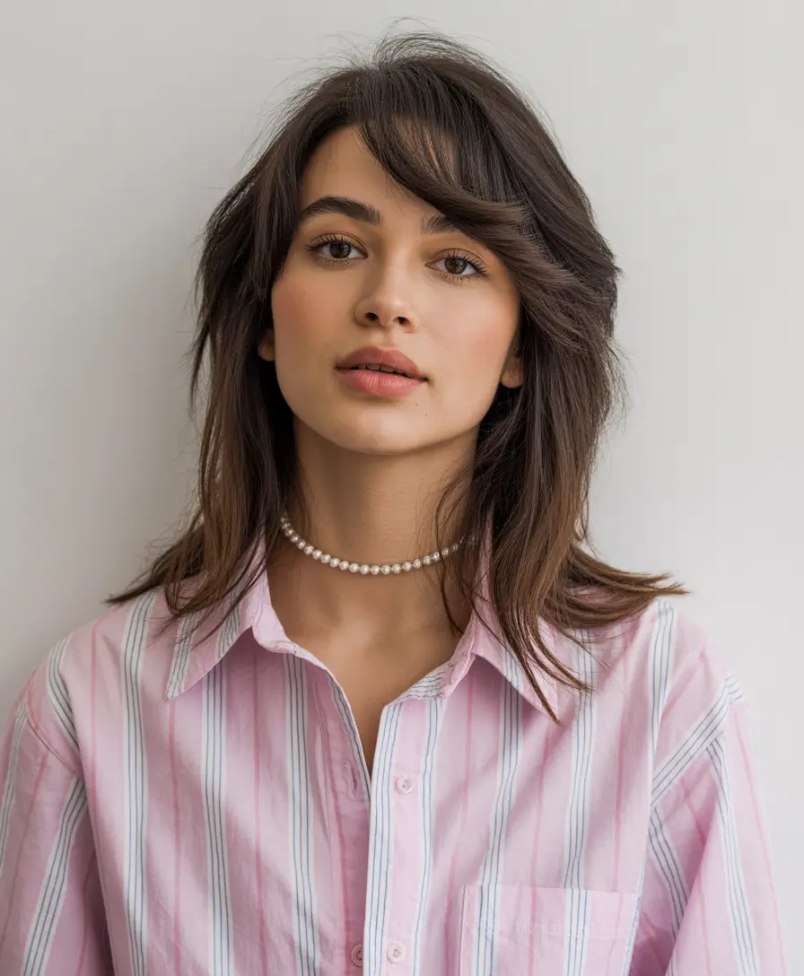 Chestnut hair that moves like velvet is something timeless, makes one feel so grounded and luxurious. That energy is precisely what this haircut encapsulates: long, feathered layers, a side bang that flows in the shape of a gentle curtain, and the slight inward bend at the ends which leaves it polished effortlessly. It is one of my favorite medium haircuts that suits in winter as it is not too warm, or too structural – a little 70s, a little now.
