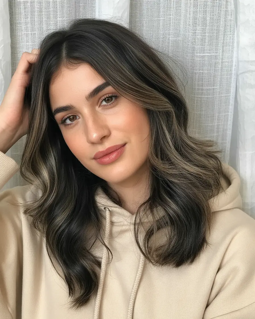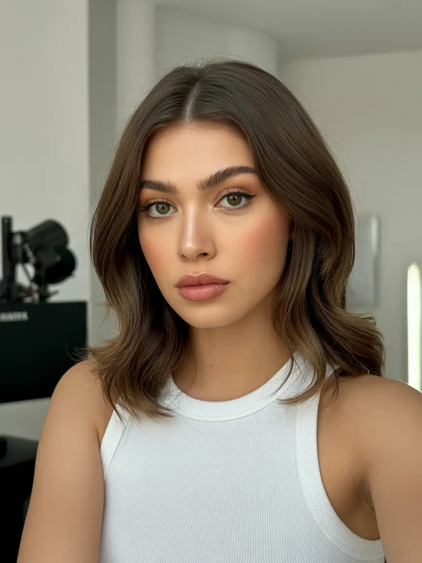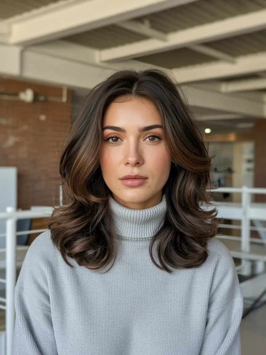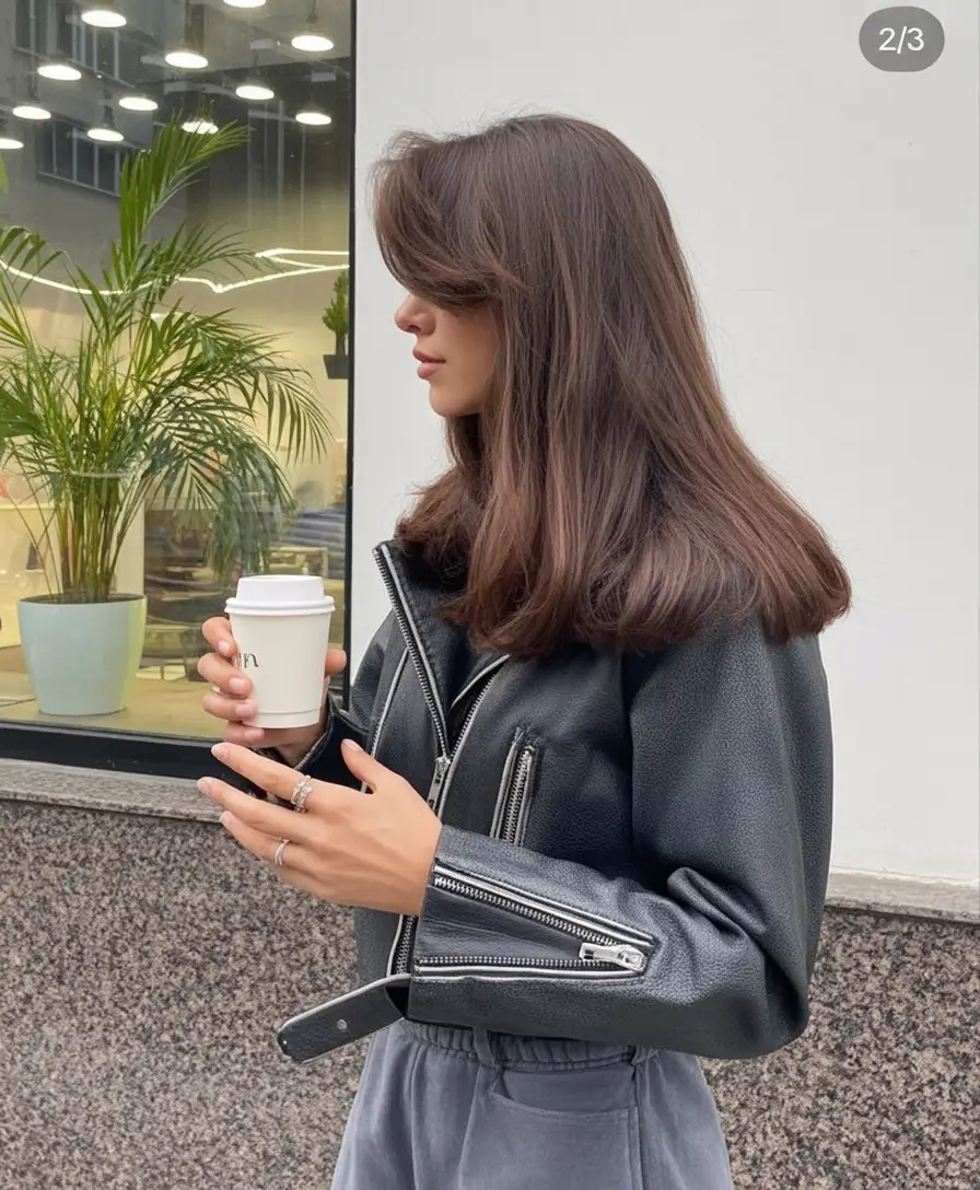 There’s something timeless about soft chocolate-brown layers that fall just at the shoulders. This look feels like the definition of quiet luxury — no overstyling, no fuss, just pure balance. It’s the kind of medium length winter haircut that works in every setting: morning meetings, candlelit dinners, or those in-between coffee runs where you catch your reflection and smile a little.