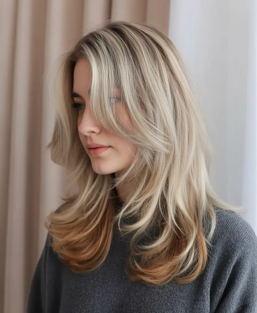 This appearance of light in winter– some golden ends of a soft ash-blonde base, which reflects the light like melted honey. The cut is made volumetric and bouncy by the layering, and dynamic but natural by the contrasting tones. It is a whimsical twist on the medium wavy winter haircut that is good on blondes who want a touch of warm but not the full-blown caramel.