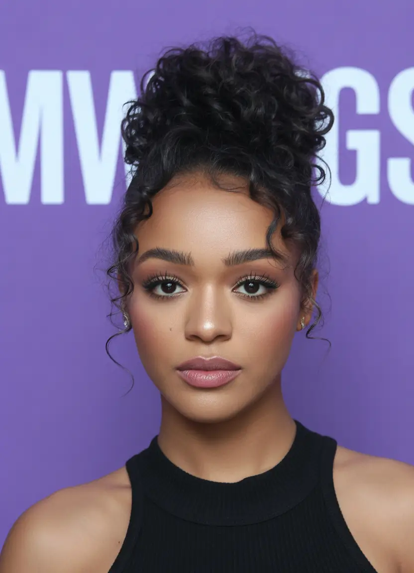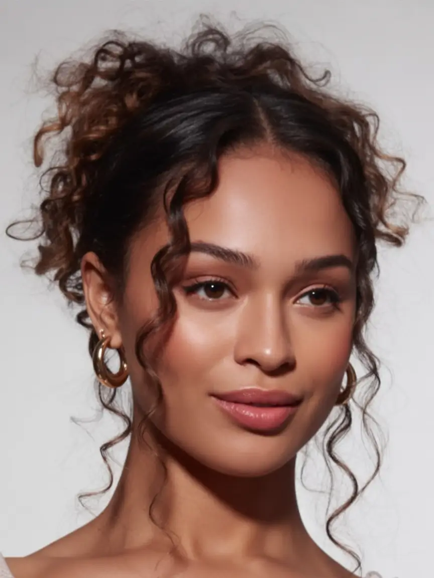 A top knot of curly hair is something old and new at the same time, the right mix of structure and tenderness. It is the type of appearance that implies the appearance of a put-together and yet friendly. The bun is raised to the head and the curls are distinguished to give the face a lift as well as personality. It is perfect in a frosty winter when you have your hair up, but not tucked up.