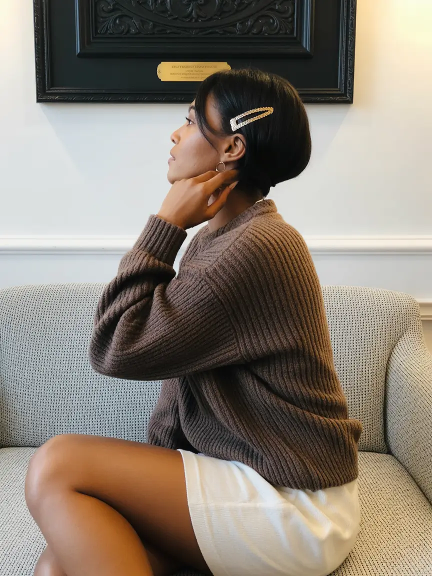 Short hair in winter? Absolutely yes. This cool bob and a statement clip are sophisticated yet never serious. It is that I have finally managed to put my hair together sort of a haircut, one that is ideal on the days when you have a lot of things to do and yet you want to present yourself as a purposeful person.