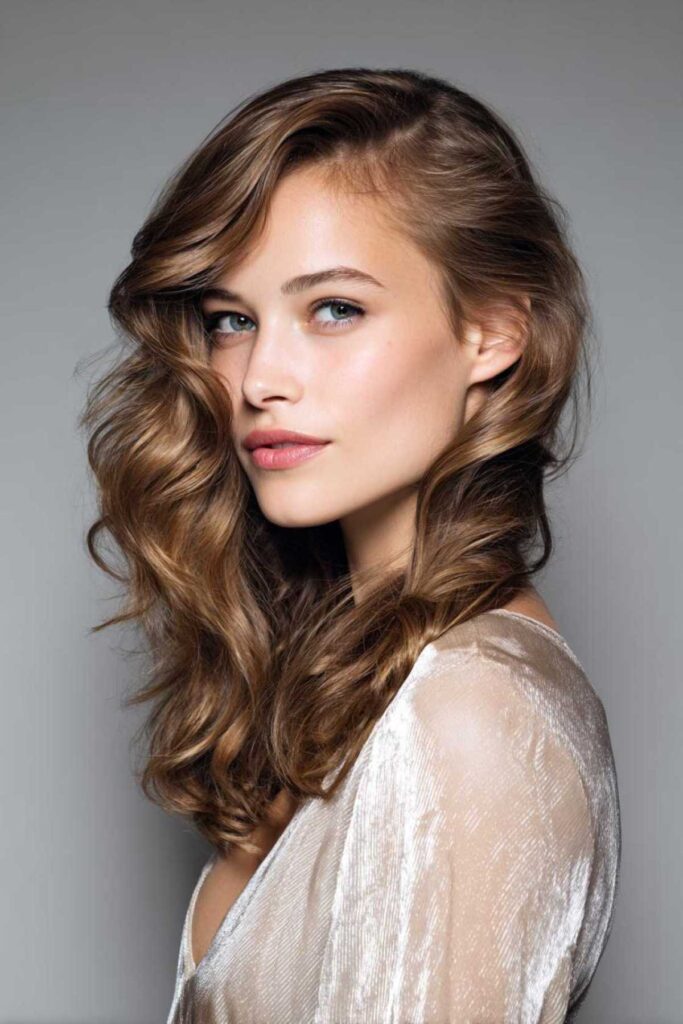 These knee length falling down waves that contain milky blonde shadow are total fall luxury. Rather, the color fades hardly noticeably root-to-tip, ending in a light, golden latte effect that looks just stunning with cool-weather color combinations. This haircut is perfect as an autumn haircuts ideas 2025 as it features the warm autumn aesthetic.