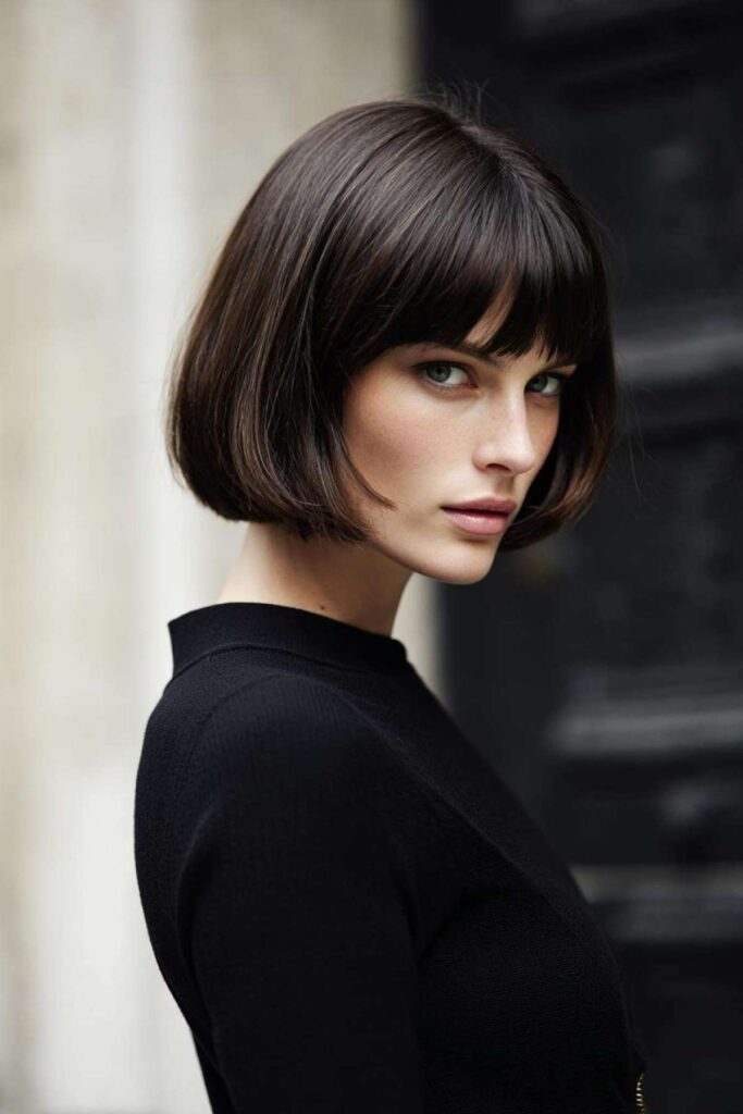 This is the type of brunette that should be in a movie. Dark chestnut and golden warmth come together in a color that resembles a cup of cinnamon-spiced coffee. The soft bob and the curved-in shape of it make it sophisticated, and the piece-y side bangs make it playful and Parisian. It’s rich, inviting, and totally timeless—without ever feeling boring. This color is magical when it comes to giving fair and medium skin tones glow.