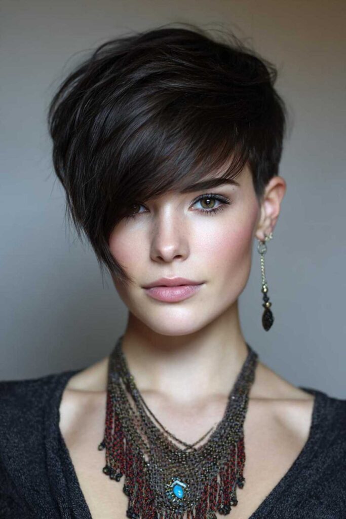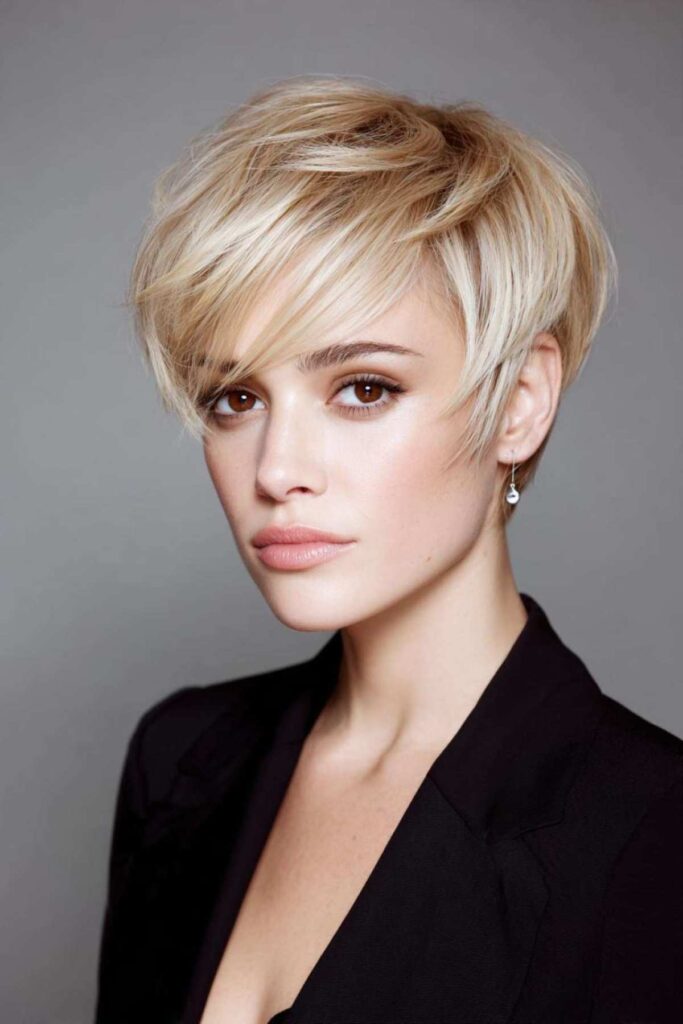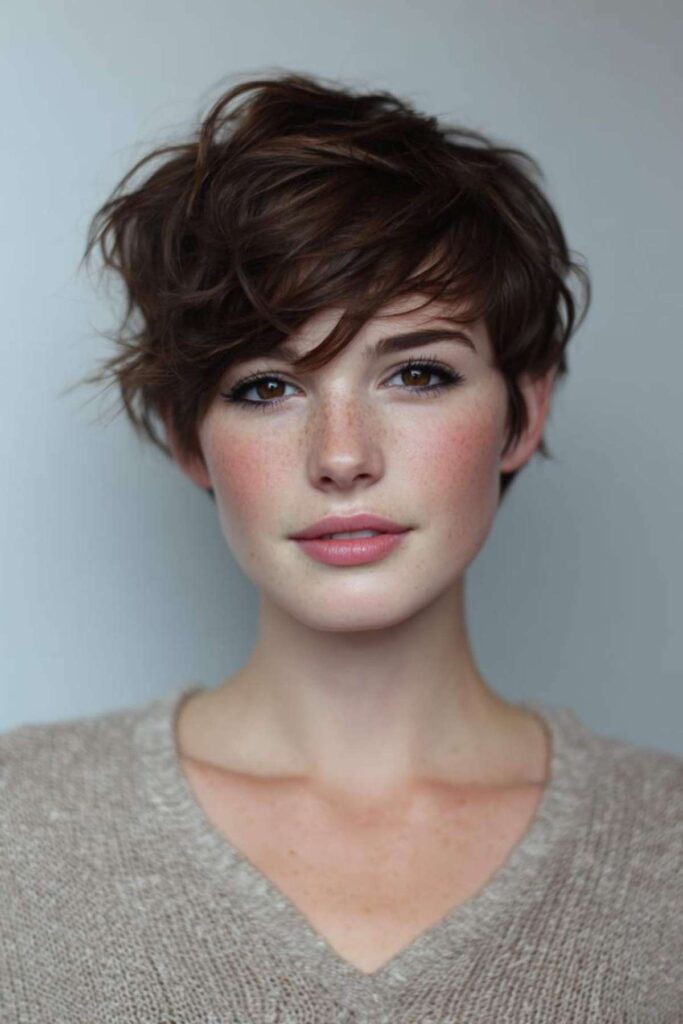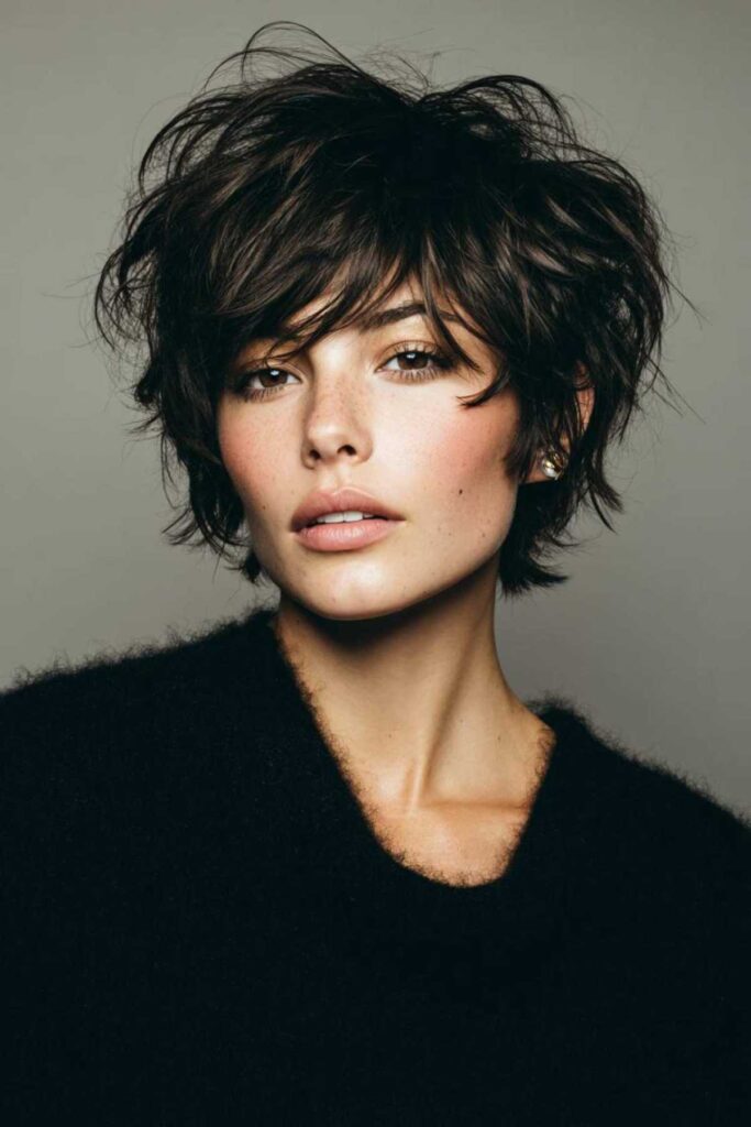 This choppy medium with a messy texture and bangs that are soft is like the cool-girl wink to fall. It is a little rock n roll, a little cozy-library-aesthetic, and completely wearable. The short length makes it a game-changer if you’re craving something quick and chic. What I love most? The fringe makes the eyes and cheekbones the center of attention, no drama needed.