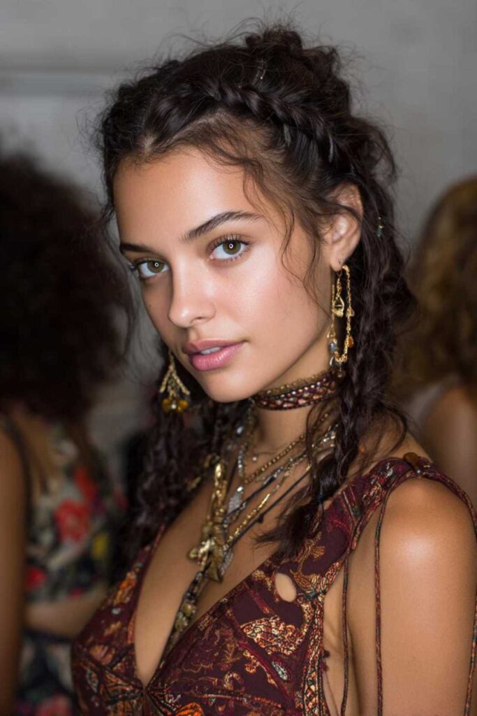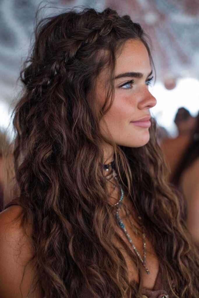 This plaited half-up crown is providing comfy cottagecore but make it 2025. It is a perfect choice when it comes to medium braids, and I particularly enjoy how it goes with loose waves to create a look that is both sophisticated and unpolished. This braid is soft and structured at the same time, regardless of whether you have medium or long hair.
