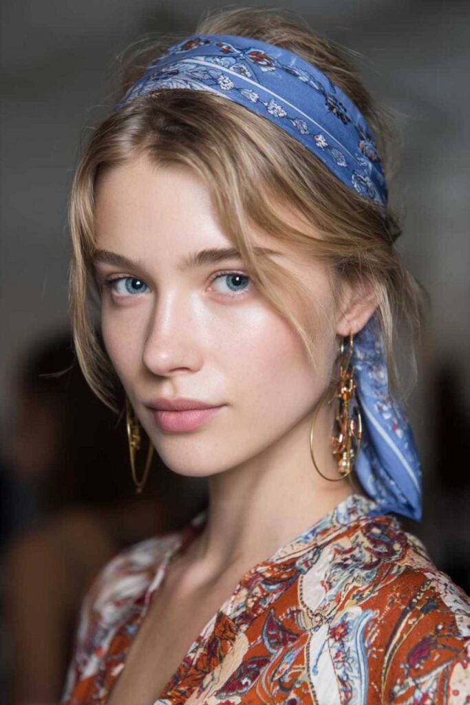 I put a regular elastic underneath to ensure that the scarf remains in place, and I tie the scarf directly on top. In case you are dealing with curly hair or layered ends, spray some water or curl-refreshing spray, such as the Pattern Hydrating Mist by Tracee Ellis Ross. It reactivates texture without the crunch.