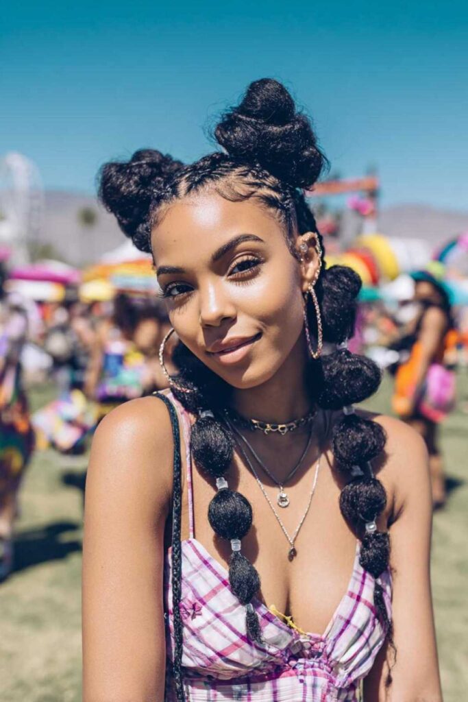 The style works best when prepped with a smoothing cream such as Kristin Ess Weightless Shine Air Dry Crme. It provides the right amount of slip so that it can tear off parts without frizzing, even in dry fall air. Use clear elastics to secure each of the bubbles and pull the sides to get volume.