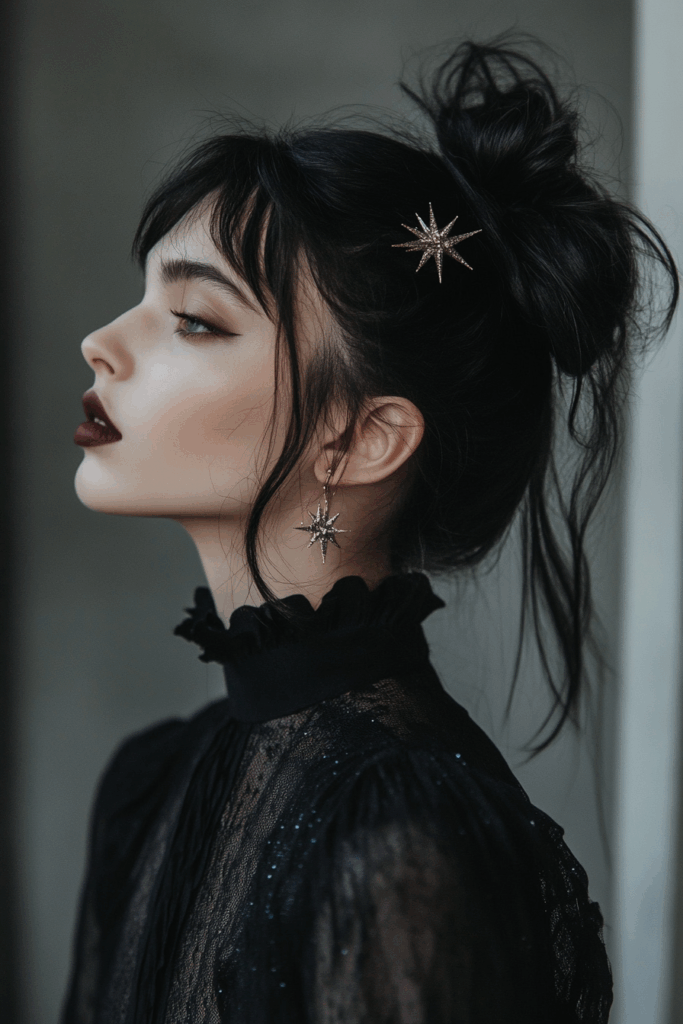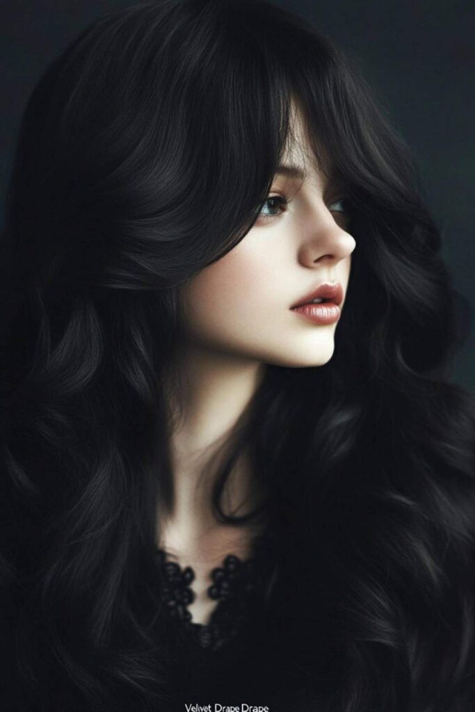 Old Hollywood glamour comes to my mind every time I see dark chocolate hair with soft fringe, but put into a modern context. The waves here are long and natural and the bangs put up about the face delicately softening it. It is beautiful, dreamy, and befitting evenings when one desires to look classy without putting too much effort.
