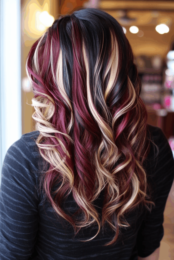 This complex color combination is incredibly rich. A maroon base is beautifully contrasted with black and blonde highlights, creating a multi-dimensional and captivating look. It’s a real head-turner.