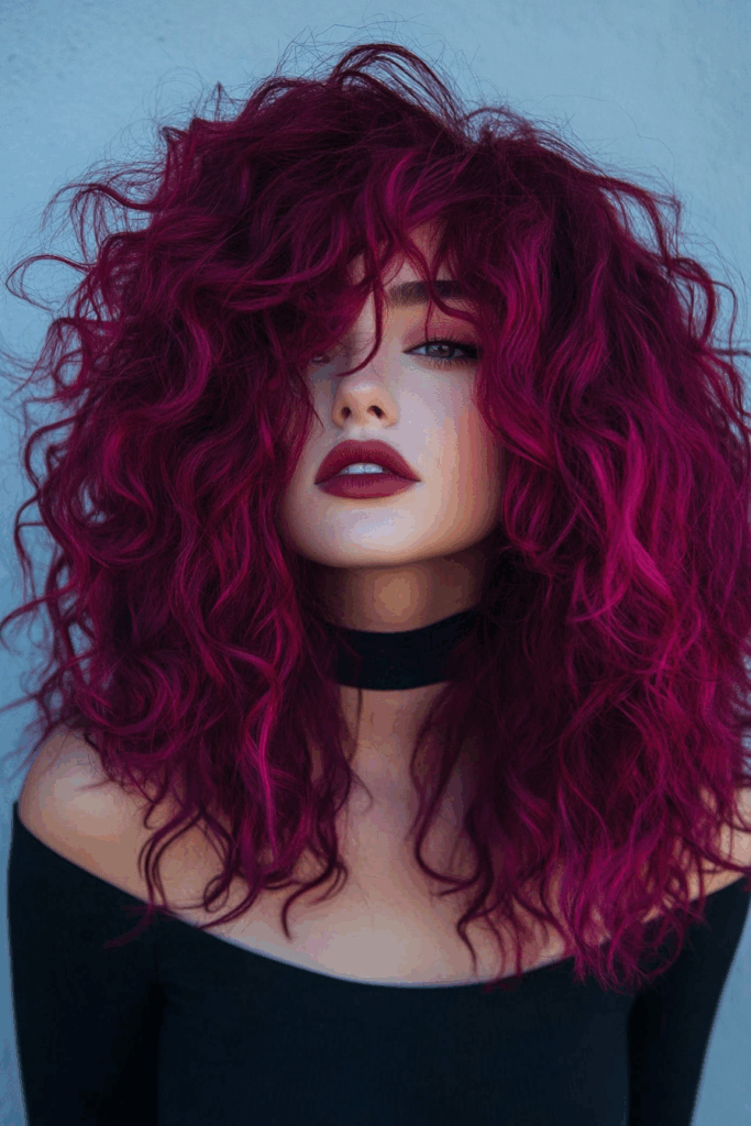 This warm and alluring color scheme blends deep maroon with touches of black and red. It’s a captivating and inviting look that enhances the natural beauty of curly hair. It feels so inviting.