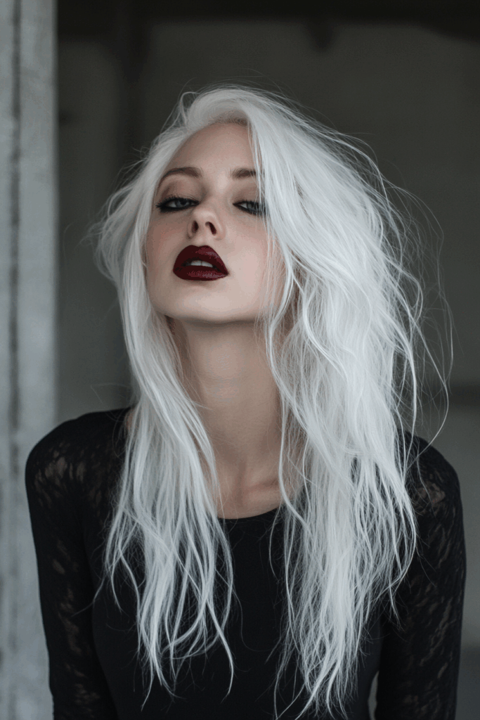 Here, the haircut leans into softness — long blonde waves styled with layers that open the face. The brightness is subtle but powerful, adding radiance to winter skin. It’s glamorous without being intimidating, romantic without feeling too polished.