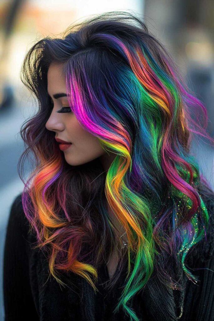 Loose waves paired with bright ribbons of color around the face give this haircut a playful edge. The highlights bring light right where you want it — accentuating cheekbones and eyes. I love how it makes the hair feel alive, like it’s glowing against winter’s muted backdrop.
