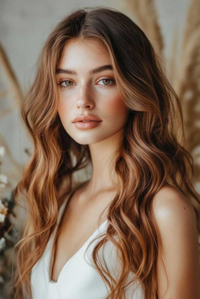 This style stretches longer, flowing past the shoulders with face-framing layers that soften everything. The warmth comes not from bold highlights but from delicate lowlights woven through, giving the hair depth and richness — perfect for cozy sweaters and candlelight dinners. It feels natural, romantic, and timeless.