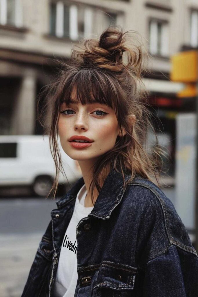 This low bun is almost sculptural, with the strands rolled backwards in an undone knot. It is neither tight nor strict, but the volume and the texture render it young and playful. It also works best in fall evenings when you need a hairstyle that is both classy and has a personality.