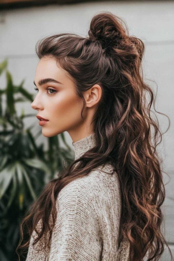 Slick on the top and bouncy on the bottom– the high pony is a timeless style, but when some loose waves are added, it can become fall 2025-ready. It is cute and elegant and takes an ordinary pony to a level where you would happily wear it to work and to brunch on weekends.
