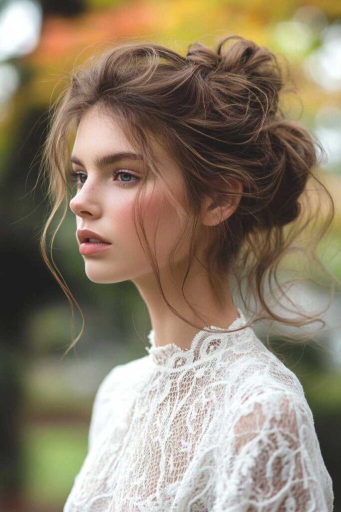The loose chignon is a classical evergreen, however, it becomes contemporary and romantic when it is arranged with textured elements and some strands around the face. This is the type of hairstyle that looks best with cozy dresses that are knit or even dress-up coats in the fall.