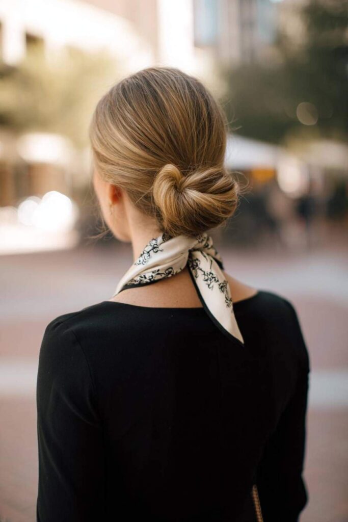 To tame any flyaways, use a smoothing serum. Apply a little to your hands. Then gently run them over your hair. It makes the chignon look super neat. It’s a finishing touch that matters.