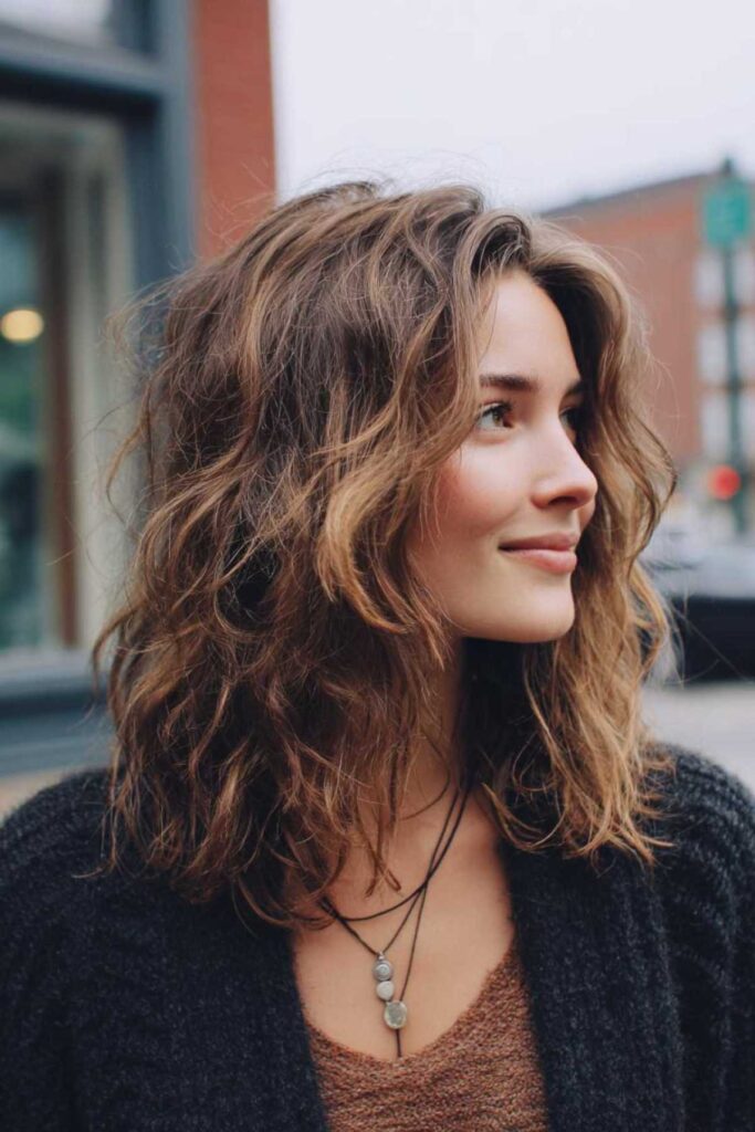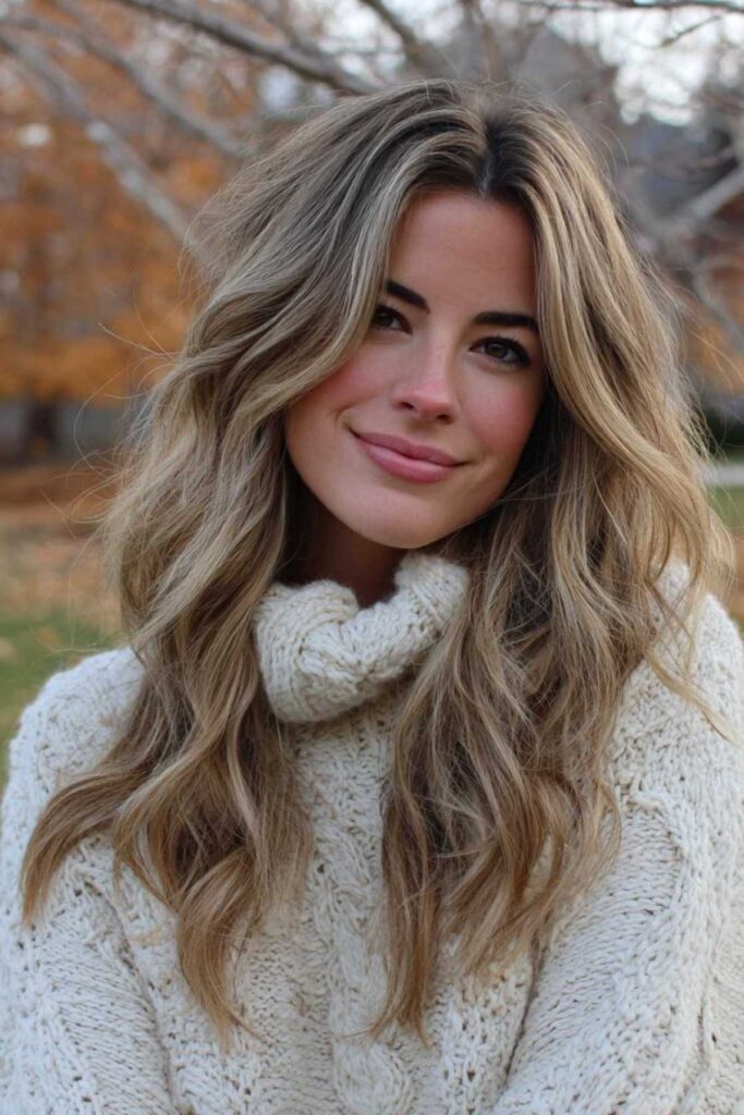 Rich, warm highlights can transform brunette locks into a vibrant autumn masterpiece, making this look ideal for those seeking to enhance their natural color. The soft waves beautifully frame the face, allowing the golden and caramel tones to shine, reminiscent of falling leaves. This style suits various skin tones and can be customized to suit individual preferences, whether you prefer subtle dimension or a more pronounced contrast. For a fresh fall look, consider adding some balayage highlights that blend seamlessly, giving your hair depth and movement while keeping it low-maintenance for the season ahead.