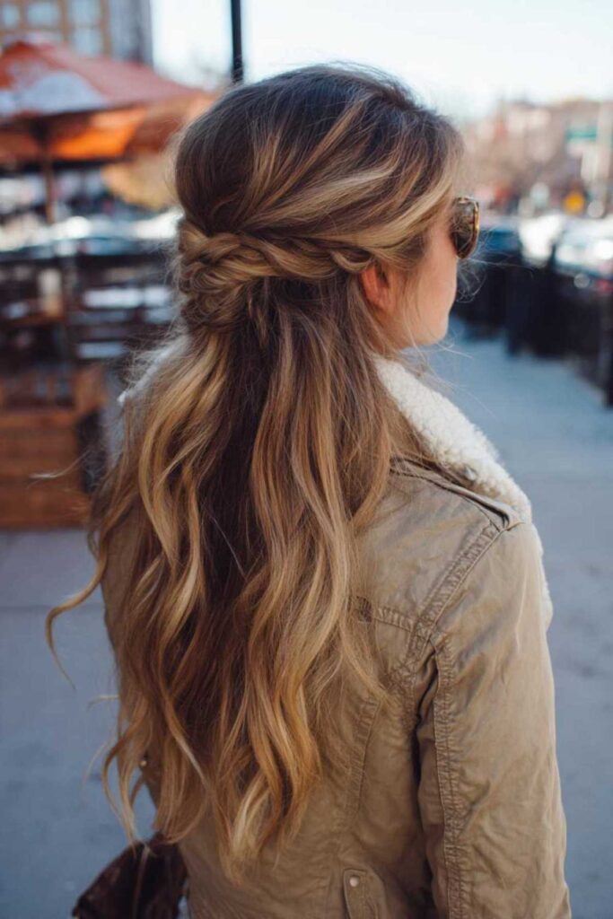 If you don’t want to tie up all your hair, a half-up top knot is a playful and stylish option. It keeps hair away from your face while leaving the rest down for movement and volume.