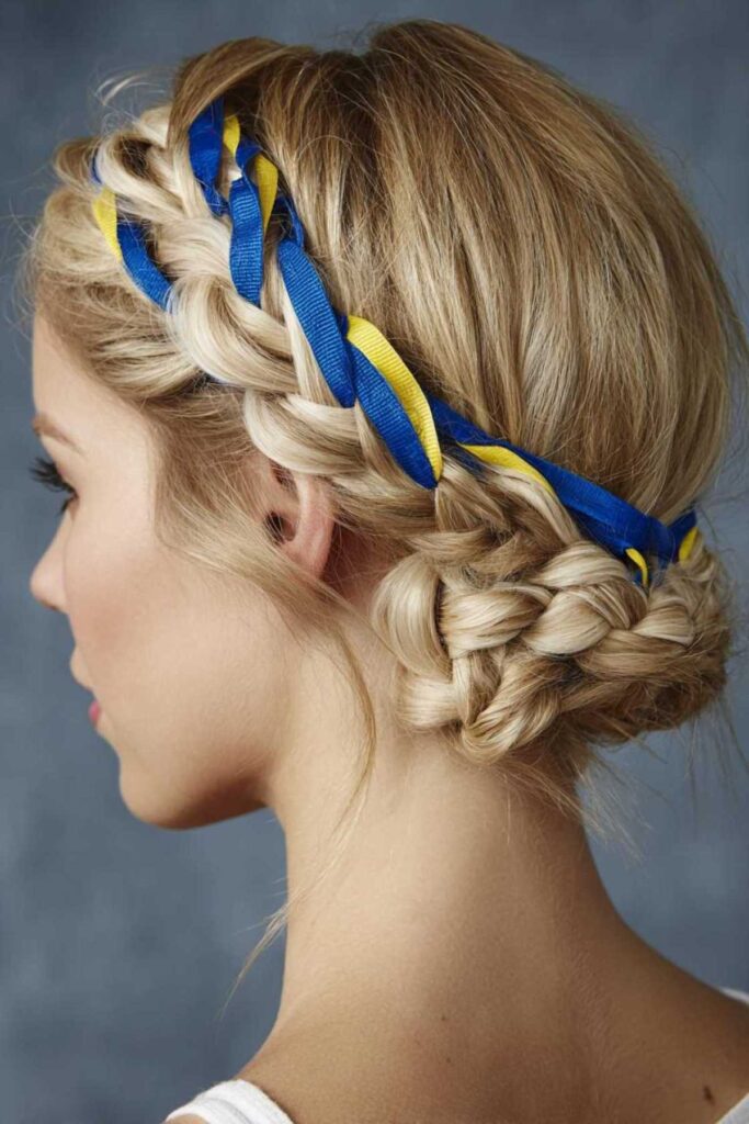 Create a beautiful crown braid around your head. Weave in ribbons in your team’s colors as you braid. This style is both elegant and spirited. It feels special without being over the top. To keep it looking polished, secure any flyaways with a bit of hairspray or a tiny dab of pomade. This ensures a clean finish.