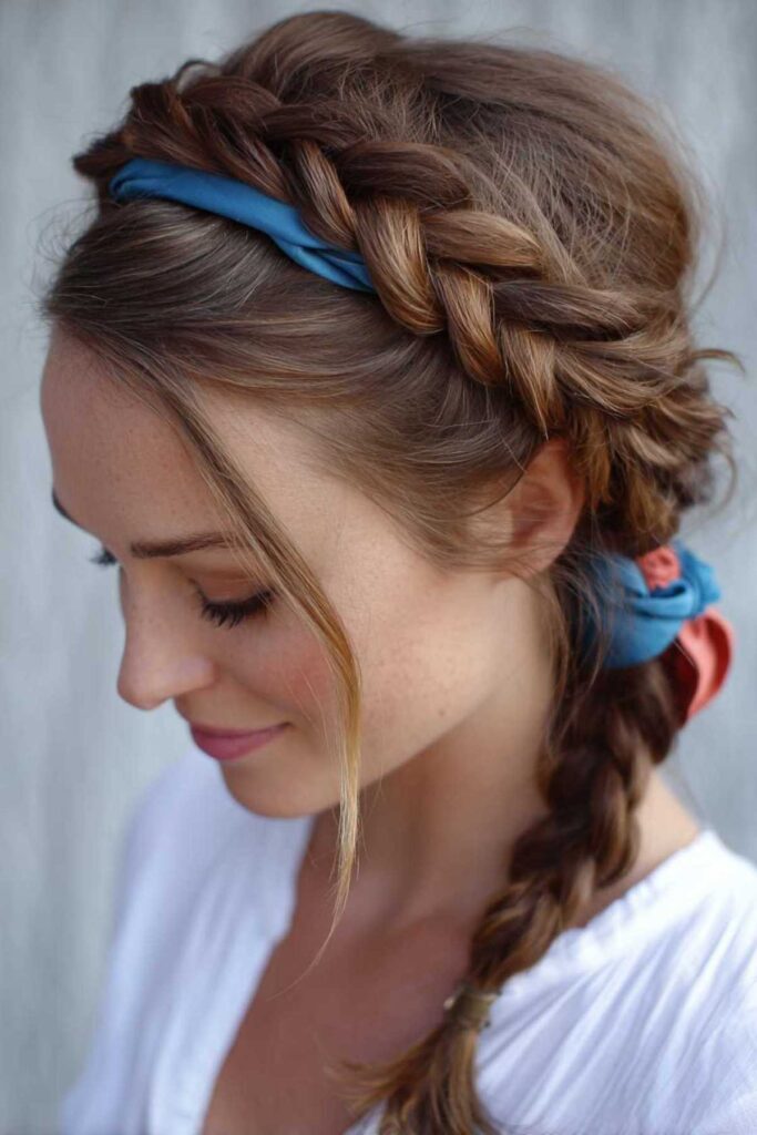 A braided crown is both bohemian and elegant. Part your hair in the middle, braid two sections, and pin them across your head like a halo. This hairstyle beautifully frames your face while ensuring no strands fall forward.