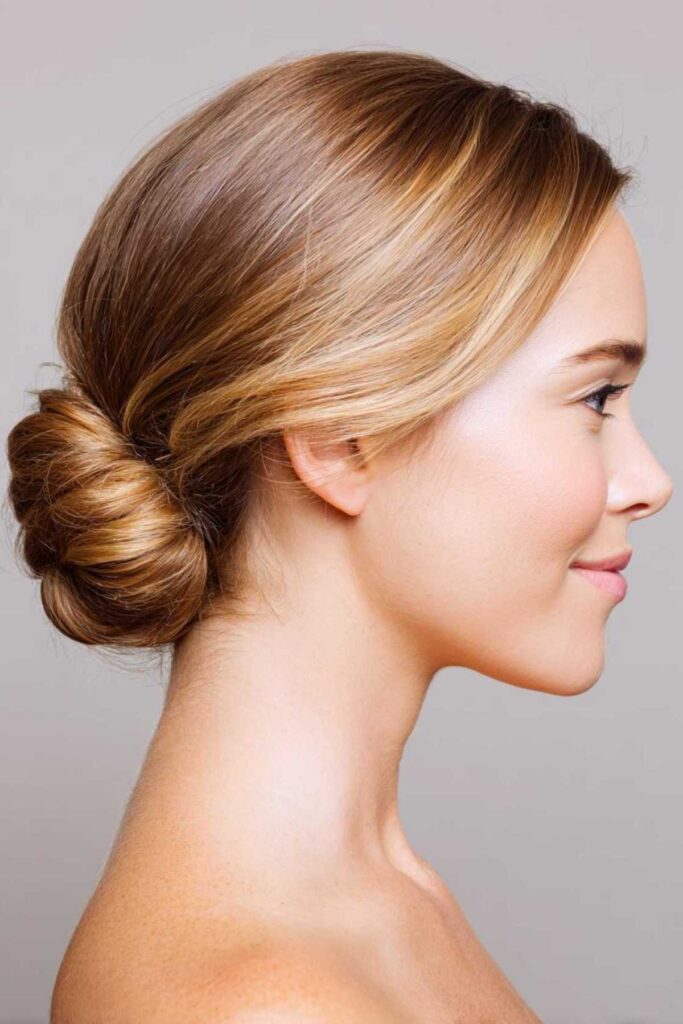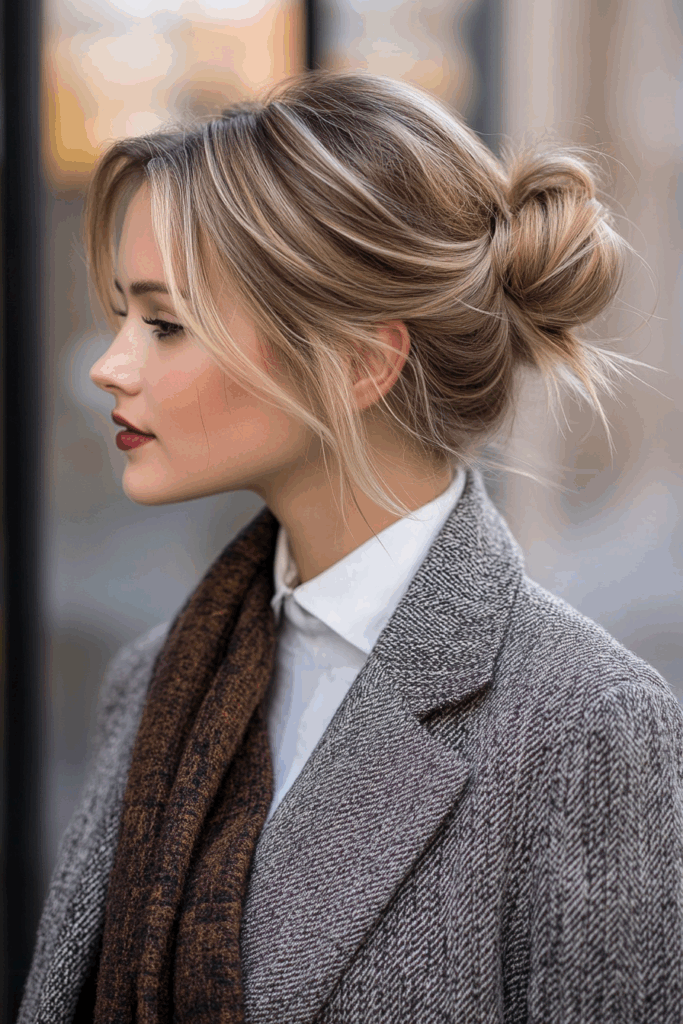 This style is my go-to for busy fall days. It’s so chic and tidy. Plus, it looks great for any occasion. You can dress it up or keep it casual. My tip? Use a texturizing spray. It gives the bun a more lived-in, stylish feel. It’s a lifesaver when I’m running late.