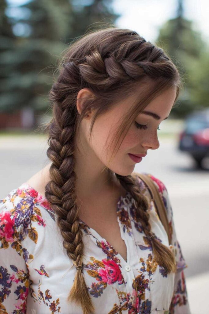 Two French braids distribute your hair evenly. They keep it off your face and neck beautifully. These braids look so neat and tidy. They’re a great option if you love the braided look. Start your braids right at the hairline. This creates a cleaner, more polished style.