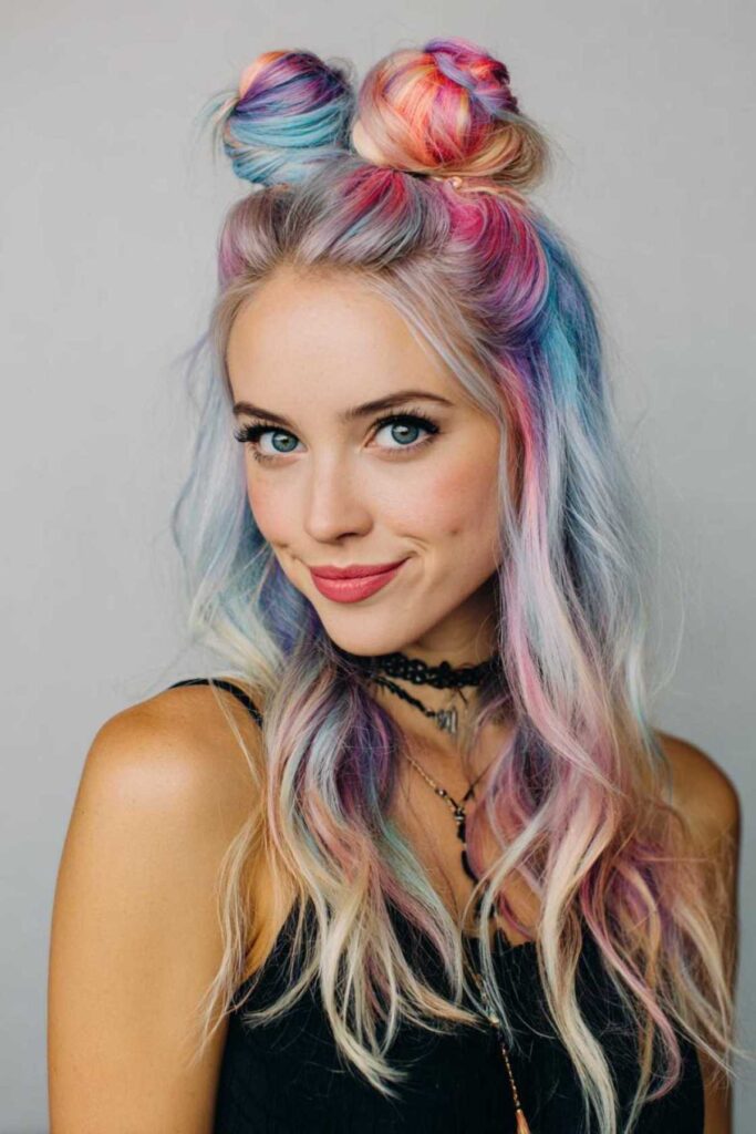 Space buns are so fun! You can wear them high on your head or lower down. This style keeps most of your hair up and away from your body. That makes it super practical for summer days. It has a playful and cute aesthetic. For a discreet hold, secure your buns with clear elastic bands. They blend right in. These are perfect for festivals or just a fun day out.