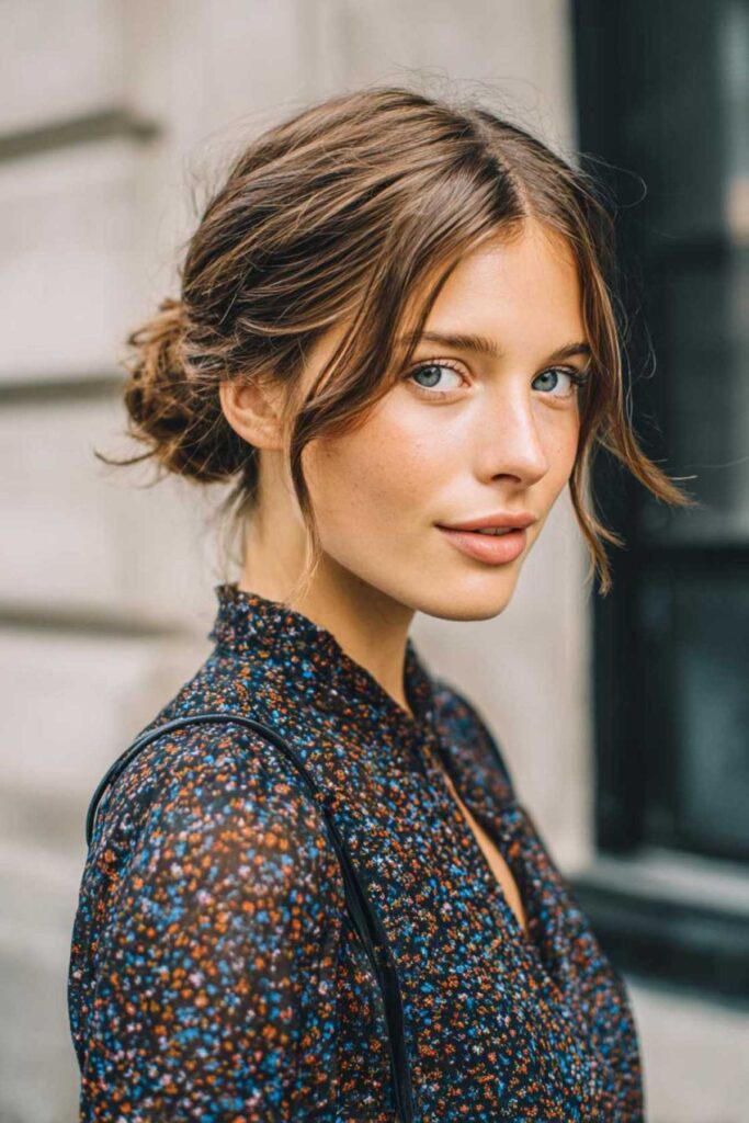 This is a simple yet elegant updo. You just twist sections of hair. Then you pin them into place. It strikes a perfect balance. It’s sophisticated. It’s also approachable. This style is ideal for a memorable first impression. It’s also super versatile. It works for many hair lengths. For a barely-there finish, use bobby pins. Match them to your hair color.