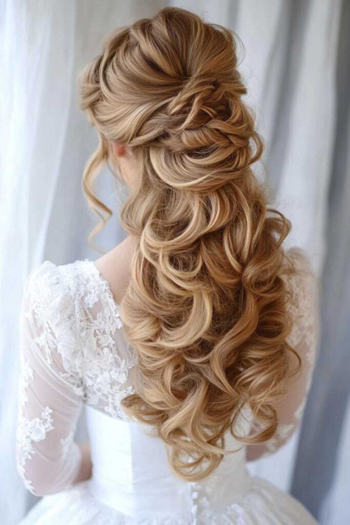 This half-up style is lovely. Braids cross the top. They create a crown effect. It’s delicate and beautiful. Great for weddings. Also wonderful for elegant dress-up. Use smaller braids. This makes it more intricate.