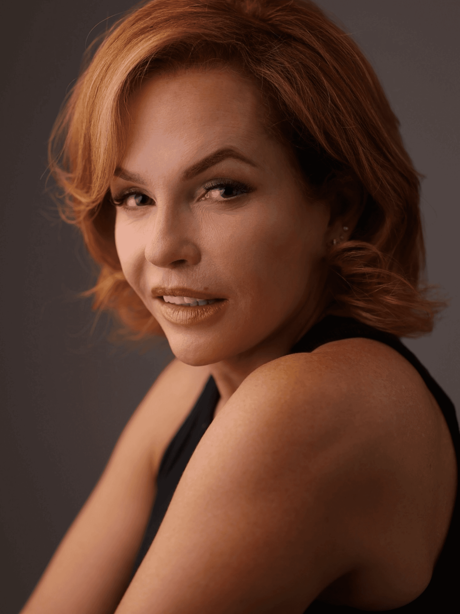 This is that glossy, vanilla-cream balayage with a natural smudge at the crown and plush, brushed-out waves. The bright around the face makeup makes the features open, the deeper internal shadowing creates a depth and the general construction is polished but not finished “off.” A silky charcoal button-down turns it into event hair—soft glam with actual movement.
