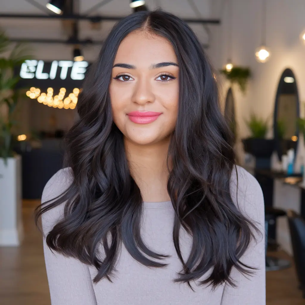This stunning photo showcases a model with beautifully tousled waves complemented by soft, wispy bangs, creating a perfect balance between playful and sophisticated. The rich, dark hair adds depth and dimension, making it a versatile choice for various face shapes. This haircut is ideal for women looking to add a touch of youthful energy to their style while maintaining an elegant vibe. If you’re considering this look, remember that the key to achieving it lies in texture; using a sea salt spray can enhance those effortless waves. Embrace this trendy cut to elevate your everyday look!
