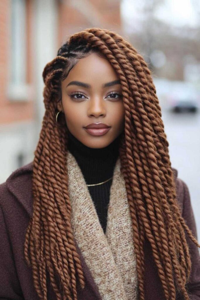 A golden blonde hair miraculously glows when struck by winter light. Long layered cut exudes all the warmth with fluffy face-framing hair which falls naturally to textured ends. It defines vertical movement that lengthens the face producing that slight contouring effect that everyone adores. It is no wonder it is one of the best winter haircut ideas 2025 2026 round faces flattering.