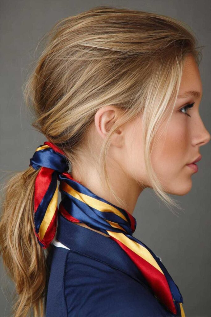 Elevate your high pony! Add a team-colored scarf. Tie it around the base of your ponytail. It adds a pop of color. It shows off your team spirit. This style is stylish for all ages. It’s especially great when matching your game day outfit. Choose a scarf that won’t slip. A silky material might slide out easily.