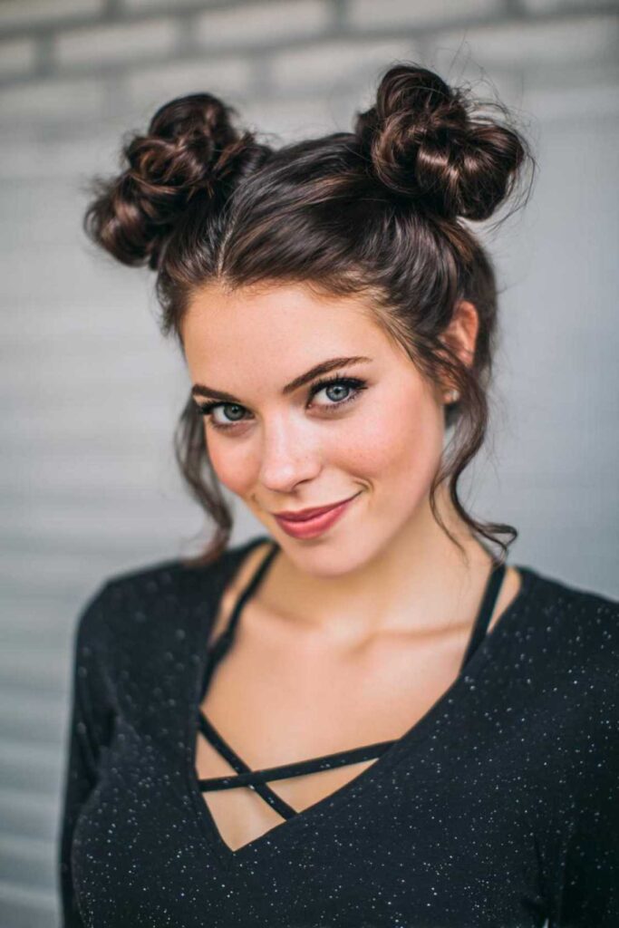 These are just too fun! Space buns are two cute buns. They sit right on top of your head. They’re playful and super secure. Younger crowds love them. But they look stylish on any age. Want more volume? Tease your hair a bit. Do this before forming the buns. It gives them great texture and lift.