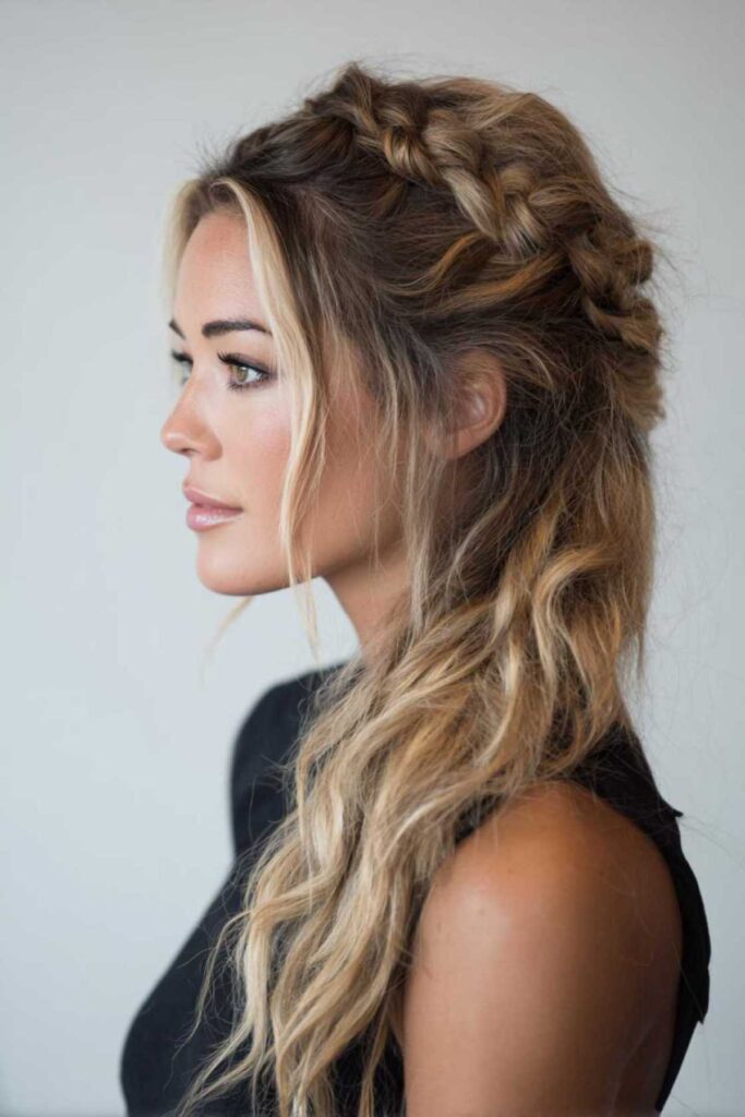 This style balances elegance and casual vibes. Take the top section of your hair. Pull it back. Braid or twist it. Secure it at the back of your head. It’s versatile for many ages. It also suits different hair types. Want a little extra flair? Add a decorative clip. Or use a cute elastic to finish.